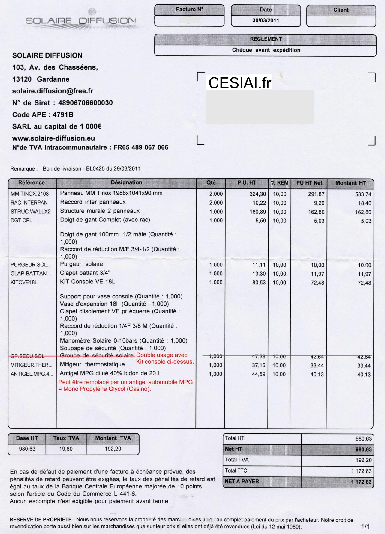 ASE à Marseille. J'ai acheté la pompe 12v et un moteur de remplacement chez Aqua Tuning. Le reste, je l'ai acheté chez Welrama, Bricodom et Castomarché en fonction des stocks disponibles. Le CESI m'est revenu à 2000 Euros, qui seront amortis en 5 ans d'après les